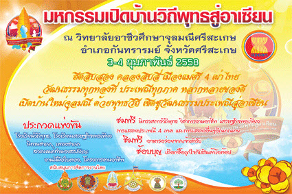 เชิญชวนสถานศึกษาและนักเรียนที่สนใจสมัครเข้าร่วมกิจกรรมการรประกวดและชมนิทรรศการด้านวิชาการ "งานมหกรรมเปิดบ้านวิถีพุทธสู่อาเซียน" ระหว่างวันที่ 3-4 กุมภาพันธ์ 2558 สิงค์ http://www.jullamaneesisaket.com/